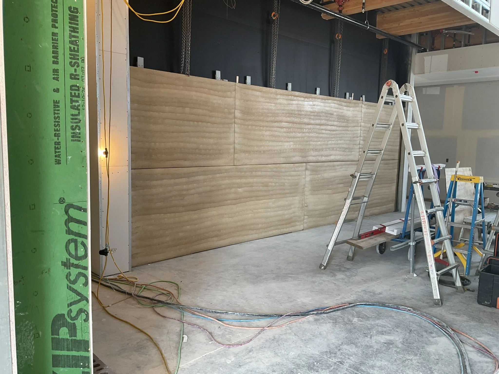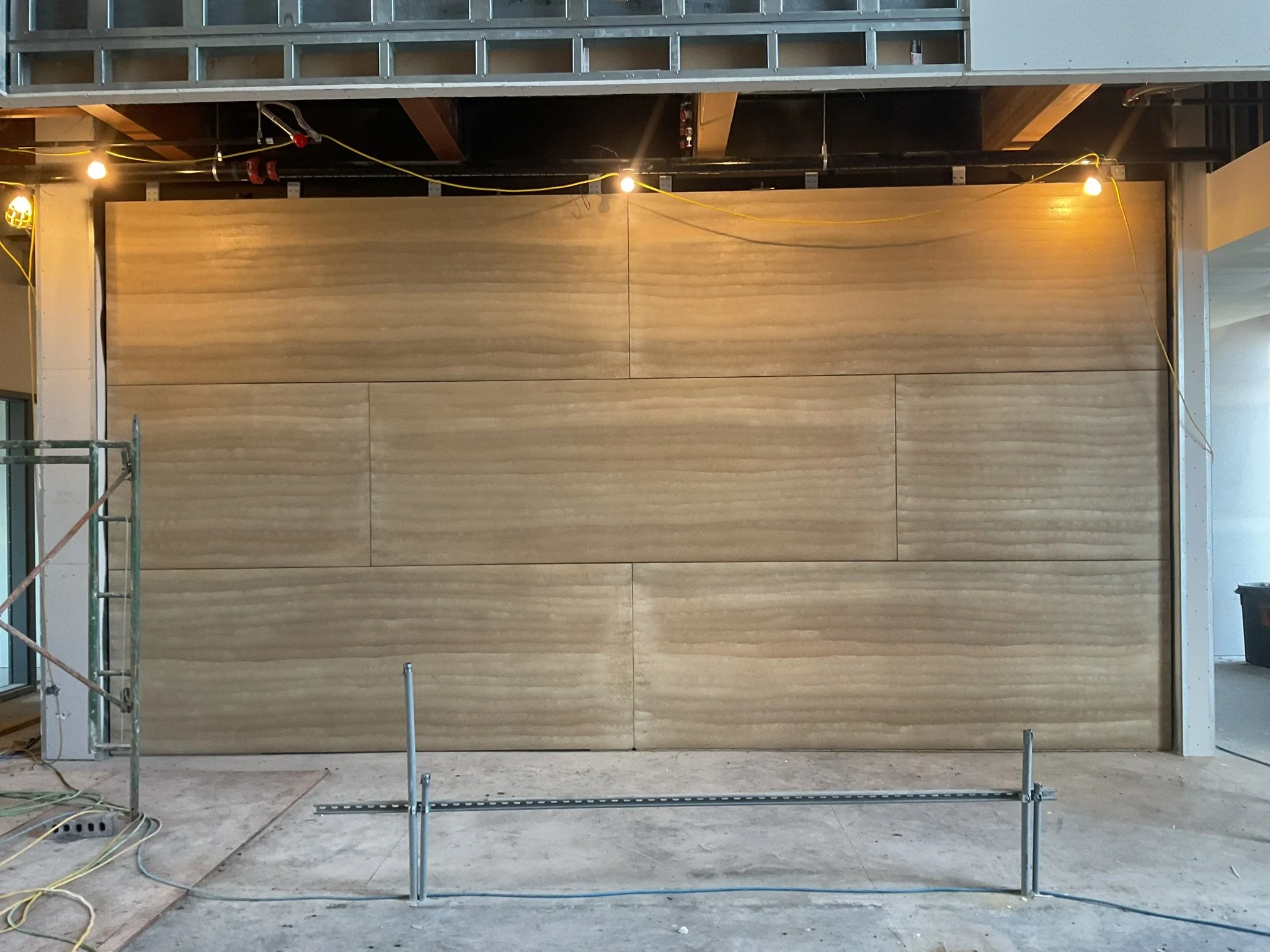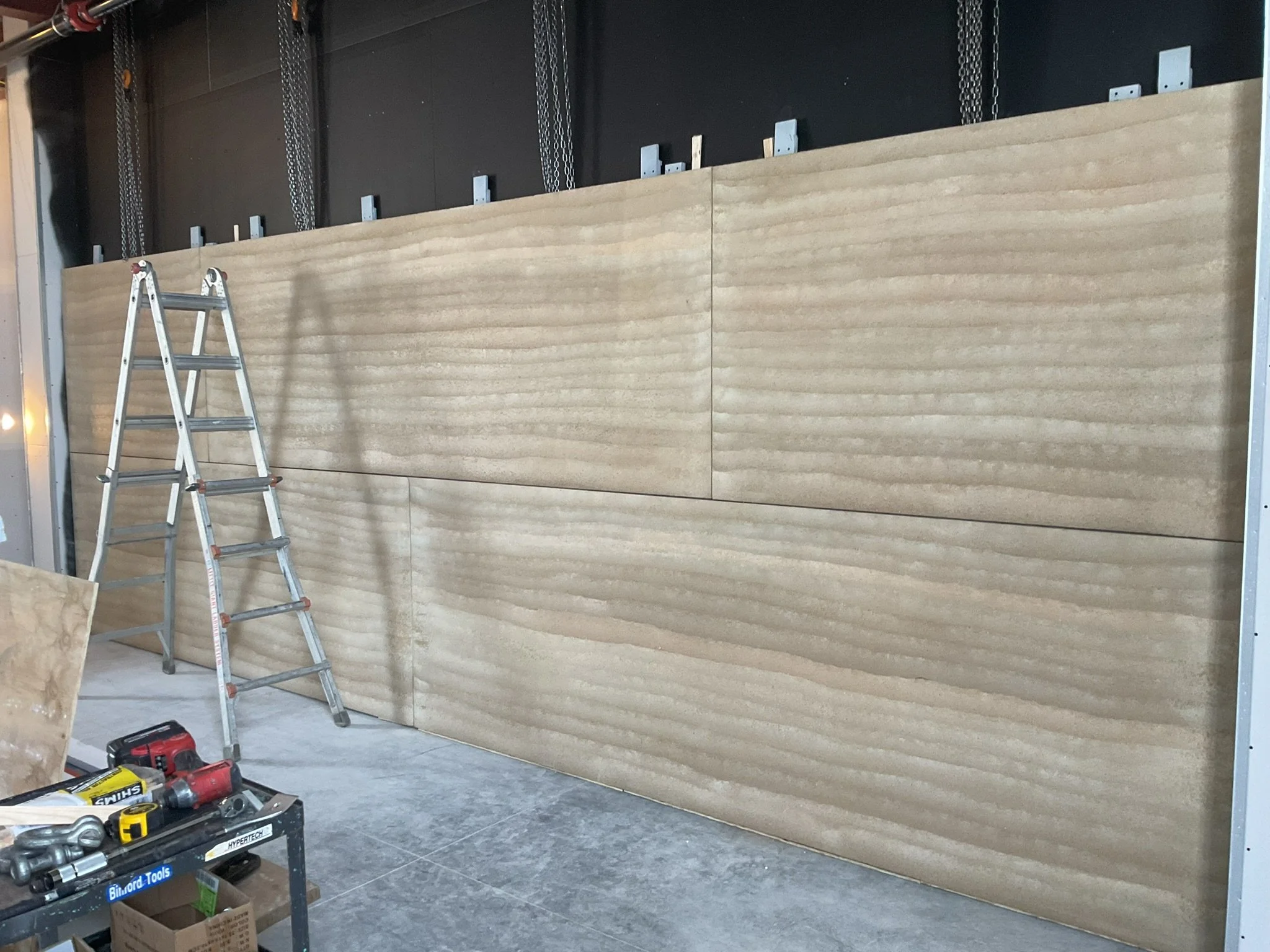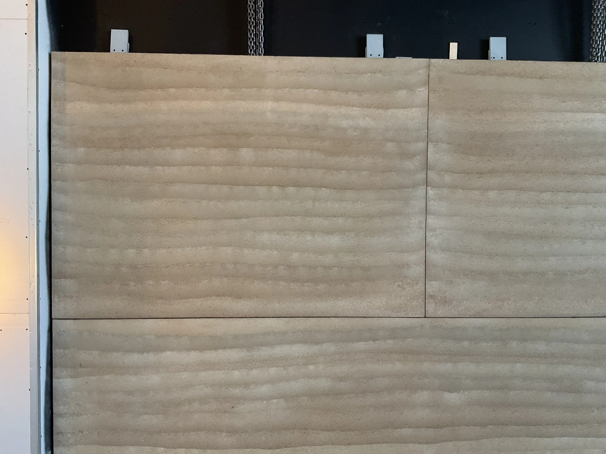 In this project, the client chose to leave the seamlines between the rammed earth panels exposed, highlighting the natural joints as a design feature. A brickwork stacking pattern was used to create a visually striking architectural composition.